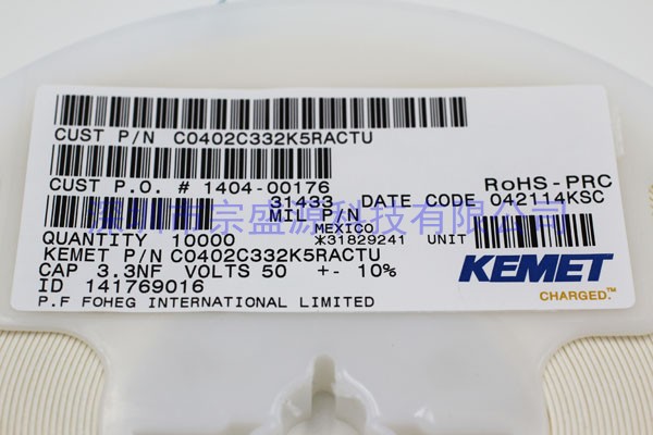 KEMET陶瓷電容 0402 50V 3.3NF C0402C332K5RACTU